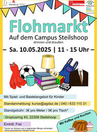 Standanmeldung ab jetzt unter kurse@agdaz.de oder 040/ 633 115 31 möglich. Kosten 3€ pro Meter oder 5€ pro Tisch (Tische werden nur drinnen angeboten). Keine gewerblichen Händler.